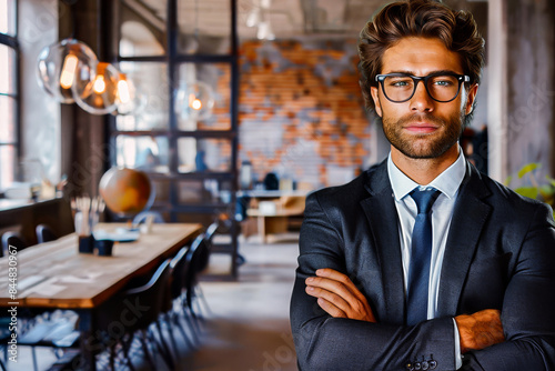Confident businessman standing in a modern office with arms crossed. The professional workspace features stylish decor and contemporary design.
