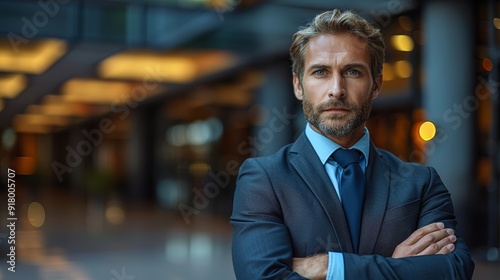 Confident businessman standing with arms crossed in a modern office lobby during the evening