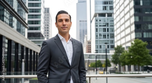 Confident businessman stands in modern city setting, hands in pockets, gazing directly at the camera.