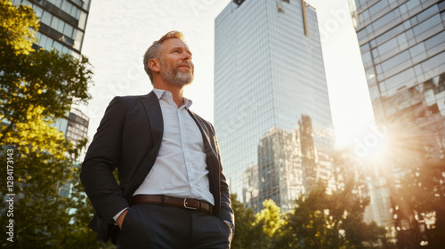 confident businessman stands in urban setting, surrounded by modern skyscrapers and greenery, enjoying warm sunlight