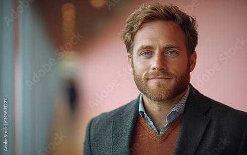 Confident businessman with a suit and a smile in a office background, He looking at the camera