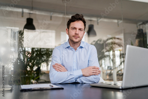 Confident businessman with arms crossed at desk in office