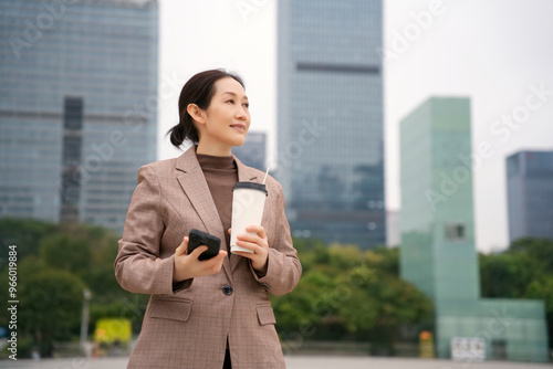 Confident Businesswoman Enjoying Coffee in Urban Environment
