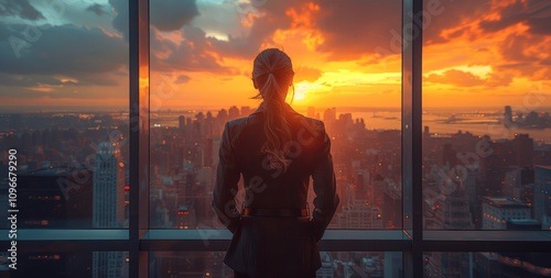 Confident businesswoman in leather suit gazing out window at downtown skyscrapers sunset professional leader in modern office reflecting on career success