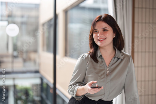 Confident Businesswoman in Modern Office Setting Holding Smartphone and Smiling