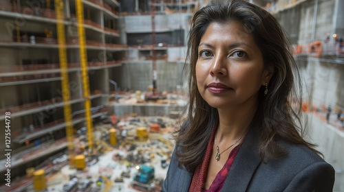 Confident Businesswoman Overlooking Construction Site of Modern Skyscraper