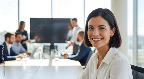 Confident businesswoman smiling in modern office meeting teamwork collaboration success leadership corporate professional career job opportunity business woman portrait