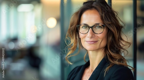 confident businesswoman with radiant smile and glasses looking offcamera in modern office setting warm lighting emphasizes professional attire and positive energy