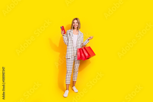 Confident businesswoman with shopping bags and smartphone, dressed in white jacket against yellow backdrop
