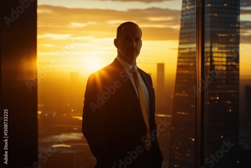 Confident CEO in high rise office during sunset with golden light reflecting off glass walls