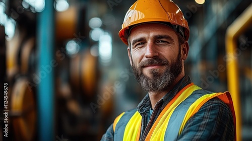 Confident Construction Worker in Hard Hat Reflective Vest Smiling in Industrial Workplace