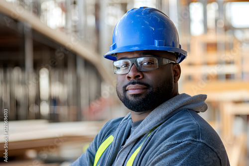 Confident Construction Worker Portrait Blue Hardhat Safety Glasses Professional Building Site Industrial Strong Man Hard Working Determined Focused