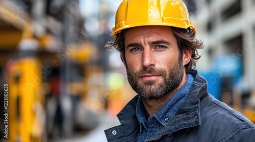 Confident construction worker wearing a yellow hard hat, standing at a building site with a focused expression, symbolizing professionalism, safety, and leadership in the construction industry.