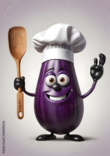 confident eggplant character with a chef’s hat and a spatula, flipping roasted veggies in the air with a proud expression, as though it's the "chef" in charge.