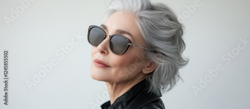 Confident elderly woman with silver hair and black sunglasses against a soft white background, embodying strength and resilience in her journey.