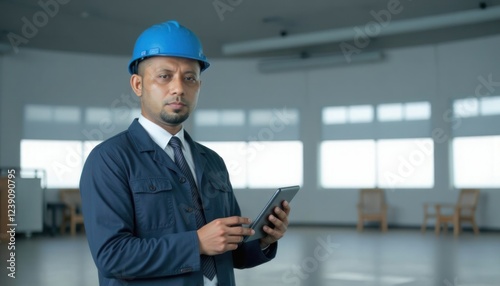 Confident Engineer Inspecting Building with Tablet