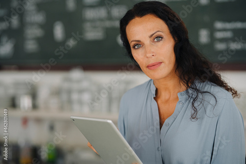 Confident female barista holding digital tablet while working in cafe