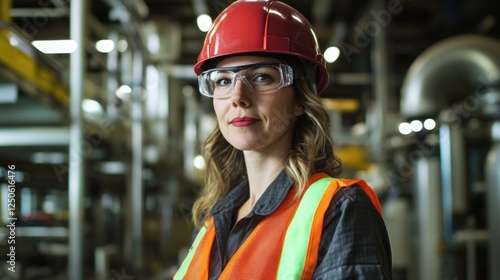 Confident female factory worker in red helmet and orange vest posing in industrial environment showcasing safety and professionalism.
