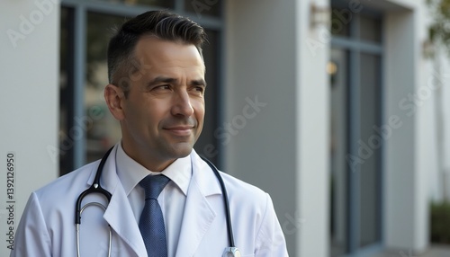 Confident Handsome Doctor With Stethoscope Outside Hospital Looking Away Thoughtfully