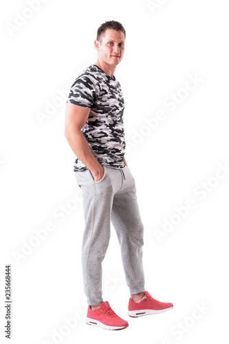 Confident happy handsome young adult man in sportswear with hands in pockets. Full body isolated on white background.