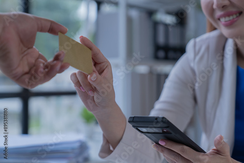 Confident happy young female, business woman leader, professional Asian business woman company manager working on laptop in office sitting at work desk looking at camera, portrait.