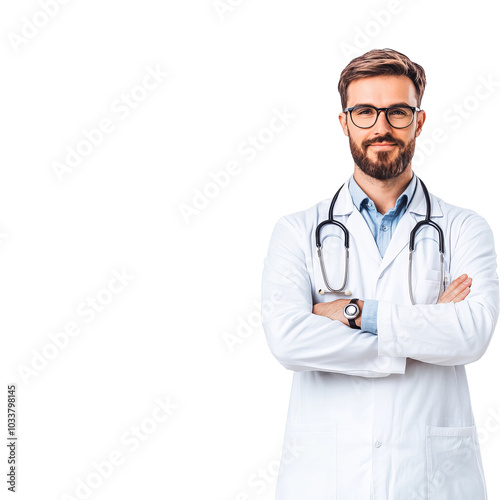 Confident healthcare professional in white coat with stethoscope on isolated background.