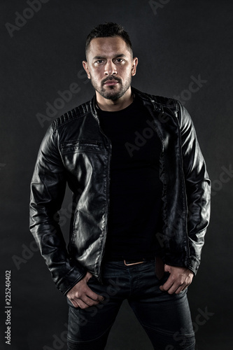 Confident in his style. Man of fashion. Muscle man with brutal style. Fashion model on fashion show. Muscle strength and power, vintage filter