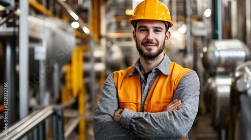 Confident Industrial Worker Portrait in Factory Setting Hard Hat Safety Gear Protective Vest Smiling Professional Engineering Manufacturing Industry Construction Maintenance Technician Equipment Heavy