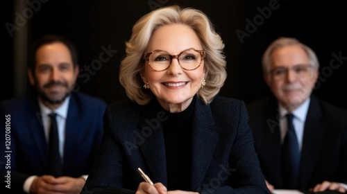 Confident Leader with Team: A portrait of a smiling, confident senior businesswoman, flanked by her colleagues, exudes leadership and success. The image projects authority, competence, and teamwork.