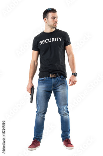 Confident macho plain clothes cop with gun looking away cautiously. Full body length portrait isolated on white studio background.