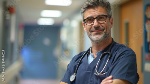 Confident male doctor with glasses and stethoscope standing in a hospital hallway, arms crossed, looking at camera.