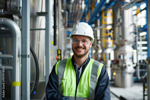 Confident Male Engineer in Chemical Plant Wearing Safety Gear Smiling in Industrial Setting