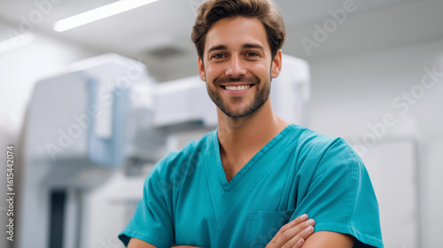 Confident Male Radiology Technologist in Teal Scrubs Next to X-ray Machine