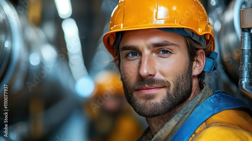 confident male worker wearing a hard hat and safety gear smiles while standing amidst large machinery in an industrial setting, showcasing teamwork and dedication to safety