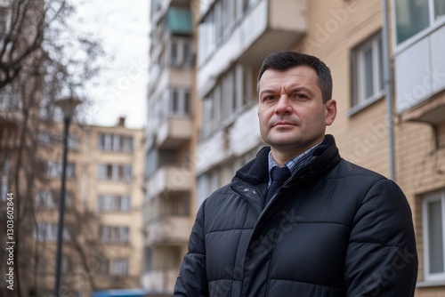 Confident man in puffer jacket stands against backdrop of an apartment building.