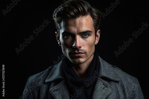 Confident Man in Stylish Outfit Posing Against Black Background in Studio Lighting
