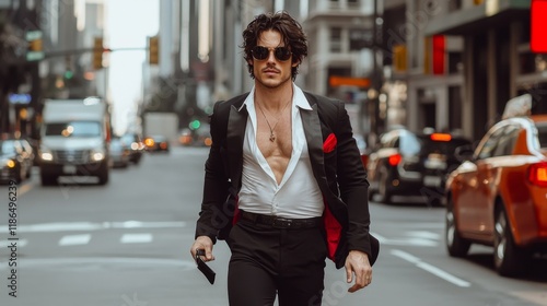 Confident man in stylish outfit walks briskly across a busy city street in urban setting