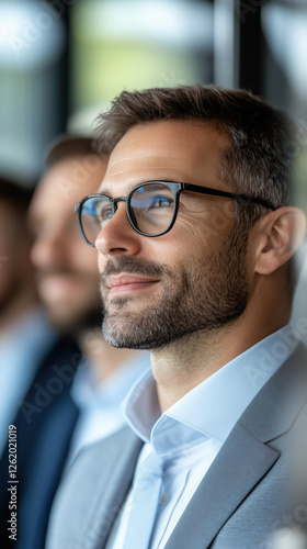 confident man in suit and glasses, looking thoughtfully ahead, surrounded by colleagues in professional setting. His expression reflects determination and focus