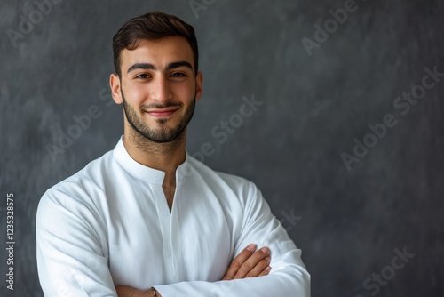 Confident Man in Traditional White Attire with Arms Crossed. Generative AI.