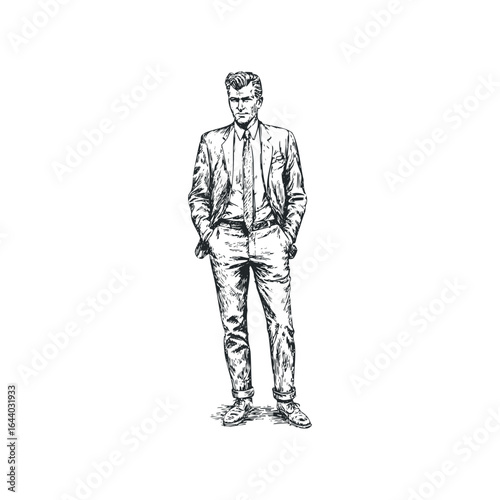 Confident Man in Vintage Suit Standing with Hands in Pockets Sketch