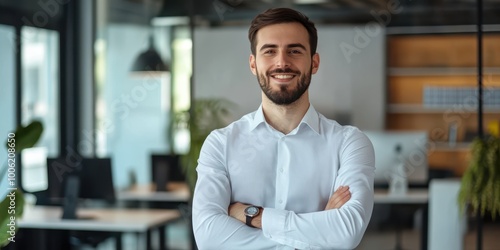 Confident man smiling in modern office, showcasing professionalism and a positive workplace atmosphere.