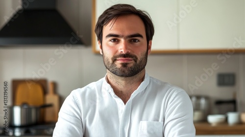 Confident Man Standing in Modern Kitchen with Arms Crossed