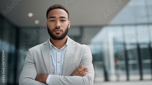 Confident man stands in modern office building during daylight showcasing professional attire and strong presence