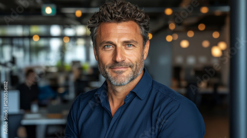 confident man with curly hair and beard, wearing blue shirt, stands in modern office environment. background features blurred office elements and warm lighting, creating professional atmosphere