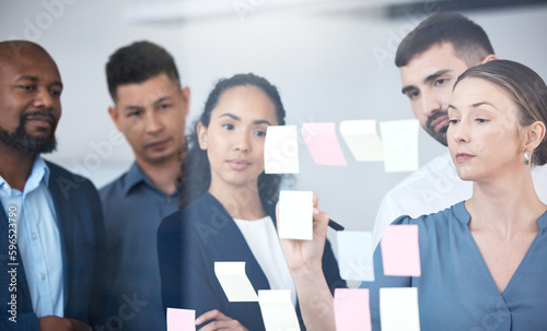 Confident manager showing and teaching team of colleagues while writing on sticky notes on transparent board in office. Diverse group of business people brainstorming and planning a strategy together