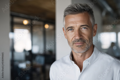 Confident mature businessman in a sleek modern office, professional corporate portrait showcasing leadership and success