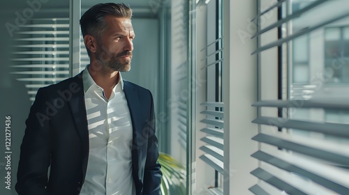 Confident mature businessman in formal attire looking through office window. Natural lighting creates professional atmosphere perfect for corporate success, leadership and vision concepts.