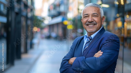 Confident mature executive posing in front of office, smiling and crossing his arms on a bustling urban street.