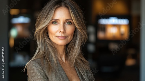Confident Mature Woman with Long Brown Hair in Stylish Blazer