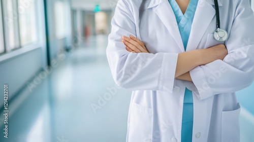 Confident medical professional in lab coat in hospital corridor for healthcare design